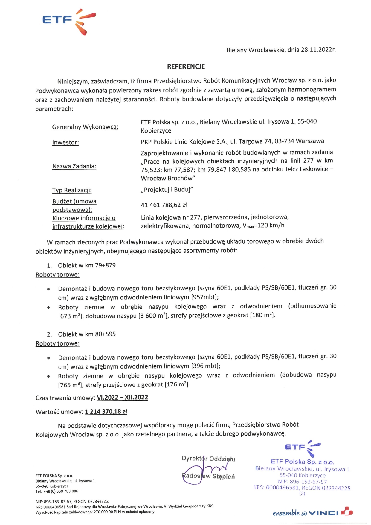 Zaprojektowanie i wykonanie robót budowlanych w ramach zadania „Prace na kolejowych obiektach inżynieryjnych na linii 277 w km 75,523; km 77,587; km 79,847 i 80,585 na odcinku Jelcz Laskowice – Wrocław Brochów”